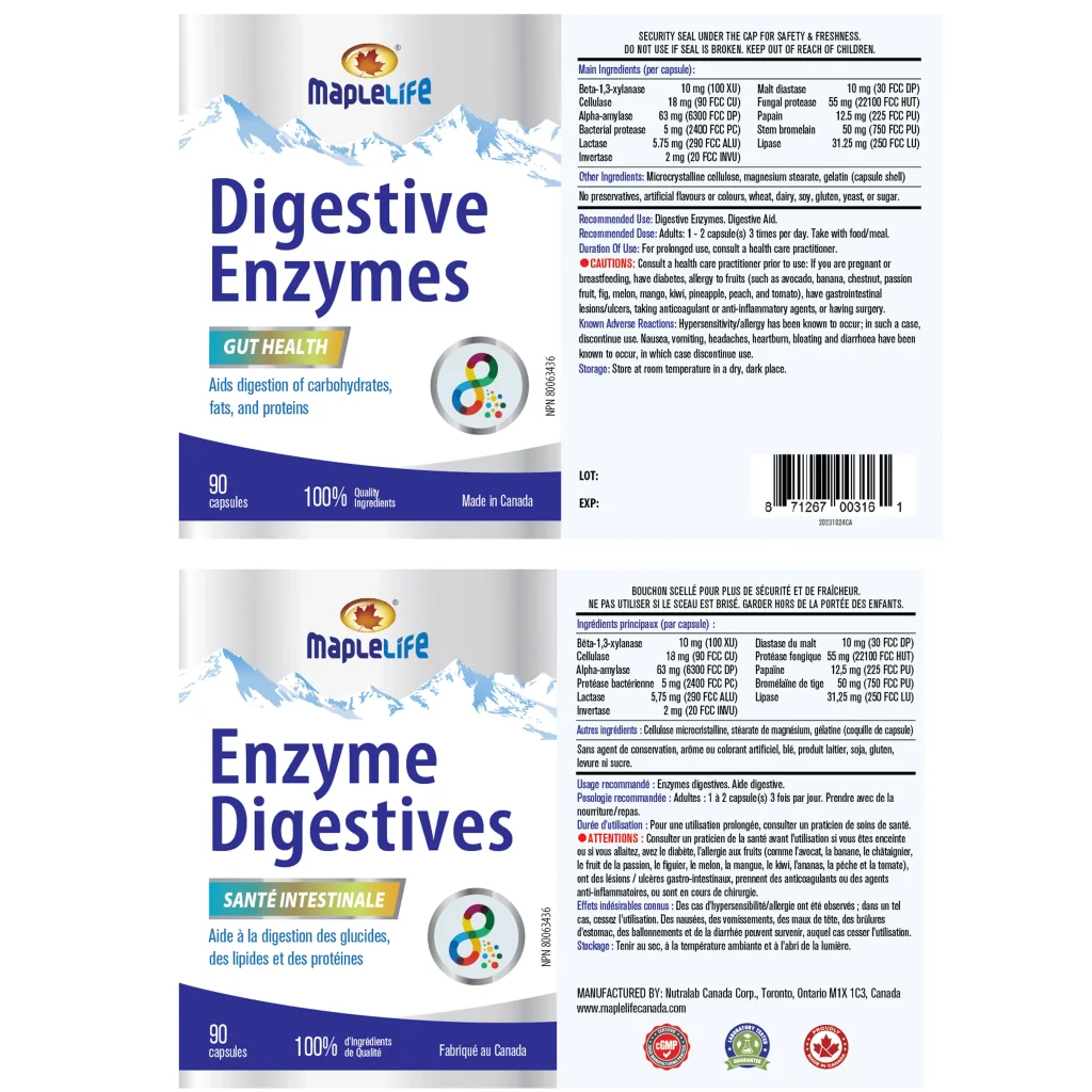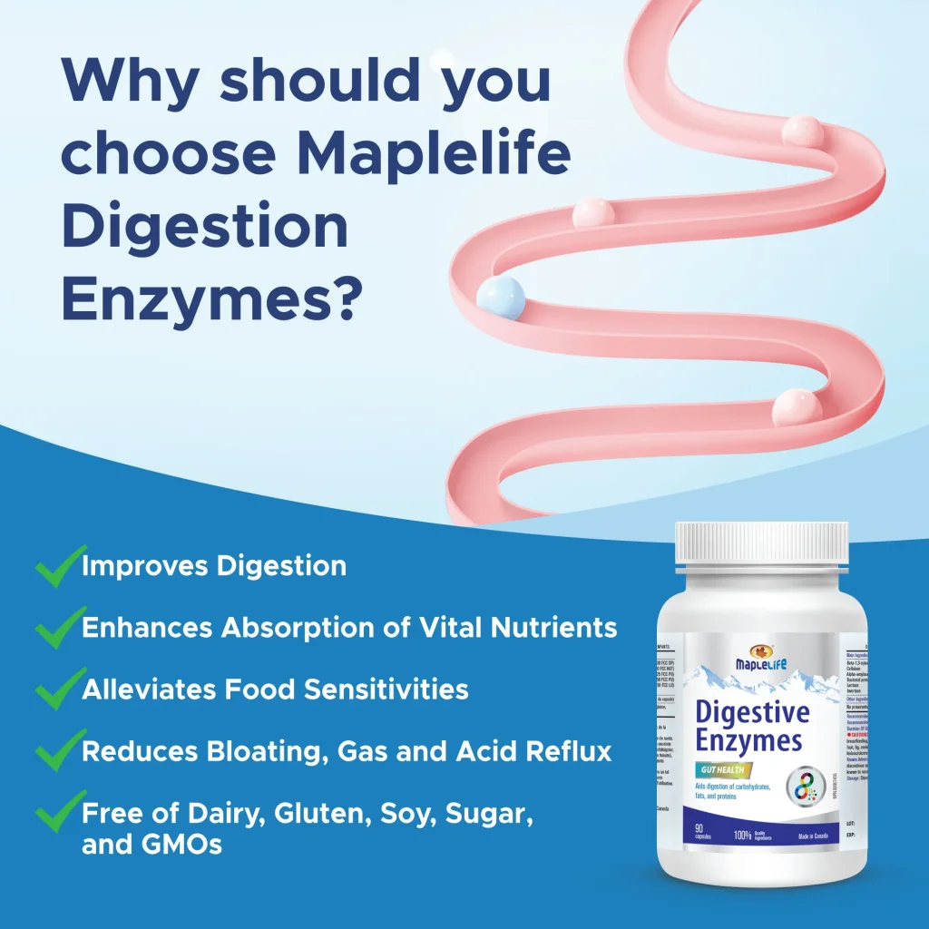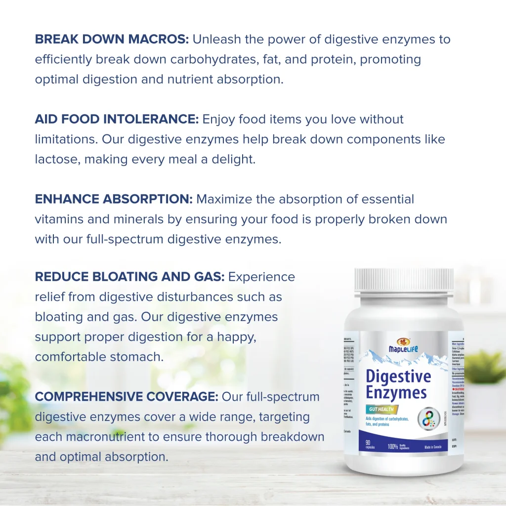آنزیمهای گوارشی مپللایف با دقت منابع طبیعی آنزیمهای گوارشی را که بهتر توسط بدن استفاده میشوند، انتخاب میکند. این آنزیمها حاوی طیف کاملی از آنزیمهای گوارشی برای متابولیسم کربوهیدراتها، پروتئینها و چربیها هستند. این آنزیمها برای افرادی طراحی شدهاند که به دلیل سایر داروها یا بیماریهای زمینهای، آنزیم کافی در بدن تولید نمیکنند یا دچار کمبود آن هستند. تولید ناکافی آنزیمهای گوارشی ممکن است منجر به سوء جذب اجزای غذا شود که میتواند منجر به کمبود مواد مغذی شود.